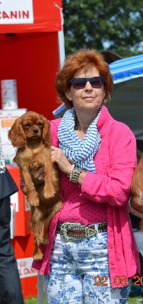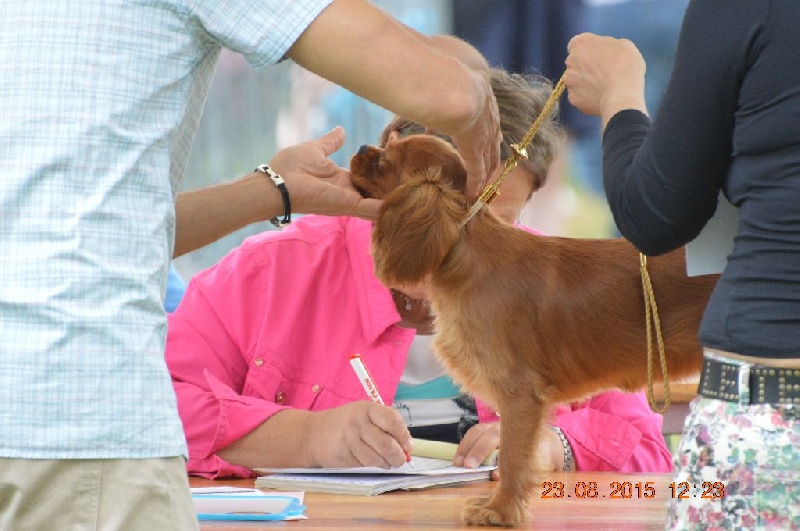 Sublime blenheim avec une tête de rêve. T beaux yeux. Exc pigm. Dentition correcte pour son âge. T belle épaule. La ligne de dos est légèrement souple. Jolie ossature. Jolis pieds. Exc ang à l'arr. Jarrets courts. Présentée en superbe état. T belles robe, franges et texture. Marche T Bien à l'avt et arr. Elle perd un peu sa ligne de dos en profil. Fait honneur à sa race